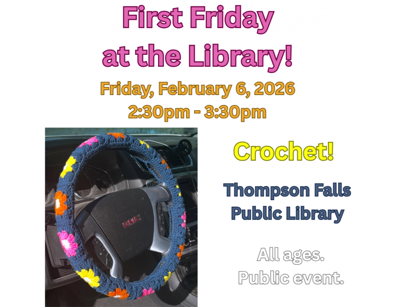 Join us Friday, February 6, 2026 at Thompson Falls Public Library from 2:30pm to 3:30pm as we celebrate crafting by crocheting steering wheel covers with the lovely Kayla Mosher!